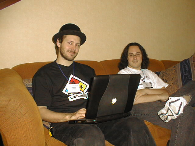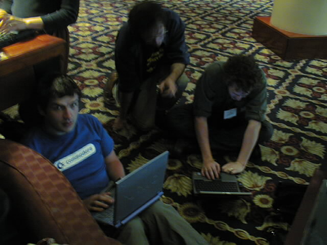 - Aaron Swartz and Wes Felter, deep in their laptops at the conference hotel lobby.