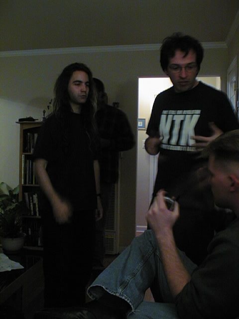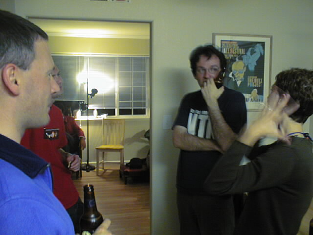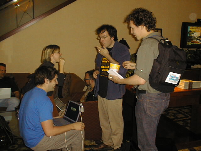 - Nelson Minar expounds something to Clay Shirky and Wes Felter.