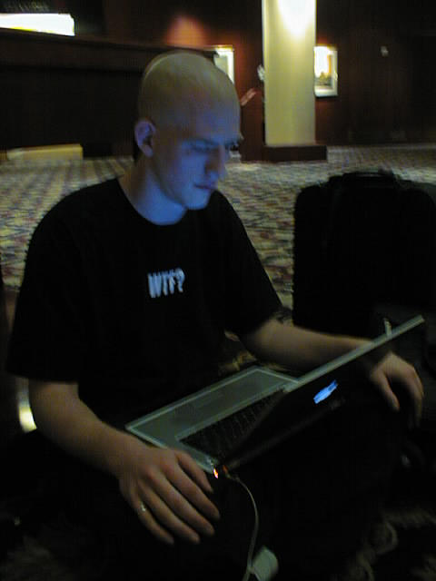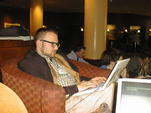- Justin Chapweske zens out with his PowerBook on the hotel lobby carpet.