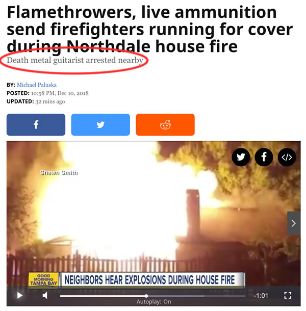 - A house in Northdale — the next neighborhood north of mine — caught on fire last night. Firefighters responded, but were challenged by explosions caused by the flamethrowers and live ammo that were stored in the burning house. (And yes, in America, it is a Perfectly Sensible Thing to have a stockpile of flamethrowers and ammo, because freedom.)