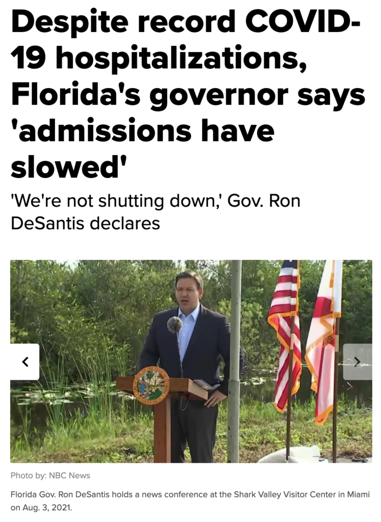 “EVERGLADES NATIONAL PARK, Fla. — Florida is not shutting down and COVID-19 “hospital admissions have slowed,” Gov. Ron DeSantis emphatically declared on Tuesday, despite yet another day of record coronavirus hospitalizations in the Sunshine State.