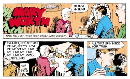 Ever wished Mary Worth would stop dropping Hallmark-card proverbs and just get down and get funky? Your wish has been fulfilled: here’s Mary and her friend Jeff doing The Black Eyed Peas’ My Humps!