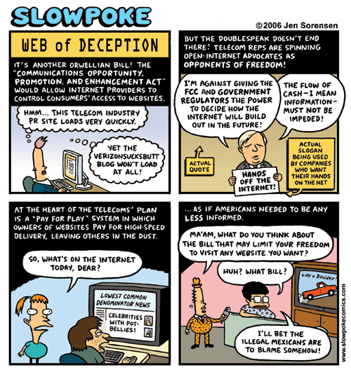 If you’re still not up to speed on the “network neutrality” debate about the internet, and you’re not a hard-core techie, you can still find out what’s going on without being subjected to too much technobabble. A good starting point is a Washington Post piece titled The Coming Tug of War Over the Internet, but an easier-on-the-eyes one is this comic by Jen Sorensen at Slowpoke Comics, titled Web of Deception: