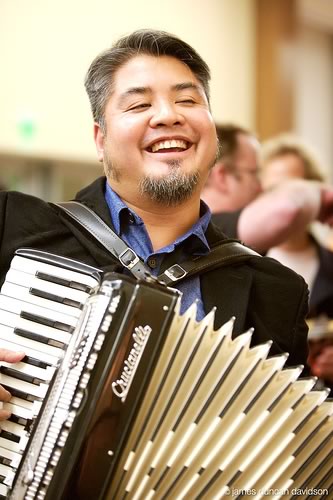 I also have to thank him for taking this lovely picture of me playing accordion at the Ajax Experience party on Tuesday night. I love this photo: it says “this guy enjoys life.” Mondo thanks, Duncan!