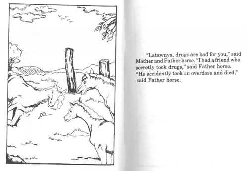“Latawnya, drugs are bad for you,” said Mother and Father horse. “I had a friend who secretly took drugs,” said Father horse. “He accidentally took an overdose and died,” said Father horse.