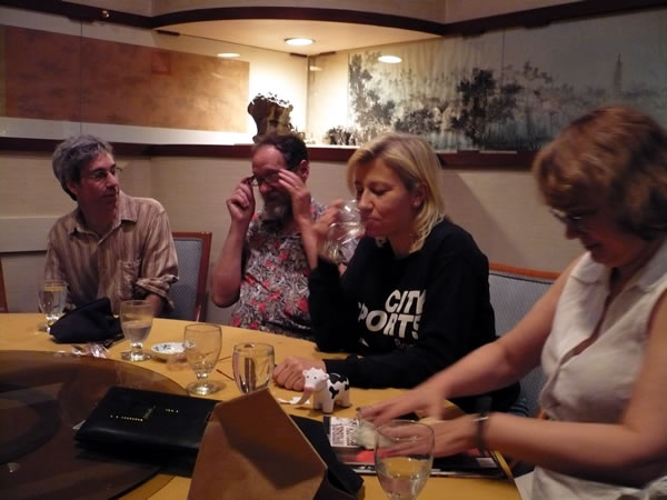 On our vacation, we had the good fortune of catching up with several bloggers from the Cambridge area thanks to the work of Betsy Devine, who organized a lunch at the Chinese restaurant Changsho. Here’s Betsy with a squishy cow I gave her, taking care of the bill: