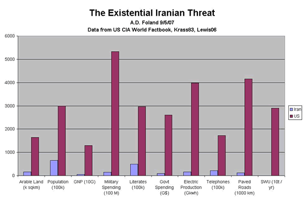 After reading comments to a Salon article on Andrew Ledeen’s new book, The Iranian Time Bomb: The Mullah Zealots’ Quest for Destruction (also covered in a recent article in National Review), Foland put together a comparative bar chart, shown below, that sizes up the U.S. and Iran on various metrics that one might use in a threat assessment:
