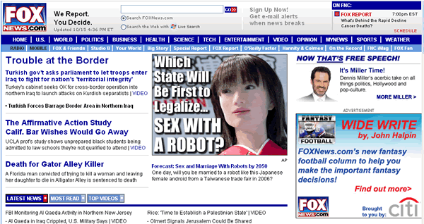 Categories Screen capture of FoxNews.com with the banner “Which state will be the first to legalize sex with a robot?” Post author By Joey deVilla Post date October 15, 2007 No Comments on Screen capture of FoxNews.com with the banner “Which state will be the first to legalize sex with a robot?” Leave a ReplyYou must be logged in to post a comment.