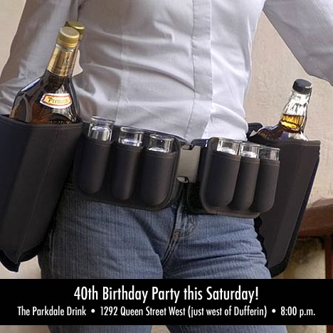 Categories 40th birthday party this Saturday – The Parkdale Drink – 1292 Queen Street West (just west of Dufferin) – 8:00 p.m. Post author By Joey deVilla Post date October 31, 2007 No Comments on 40th birthday party this Saturday – The Parkdale Drink – 1292 Queen Street West (just west of Dufferin) – 8:00 p.m. Leave a ReplyYou must be logged in to post a comment.