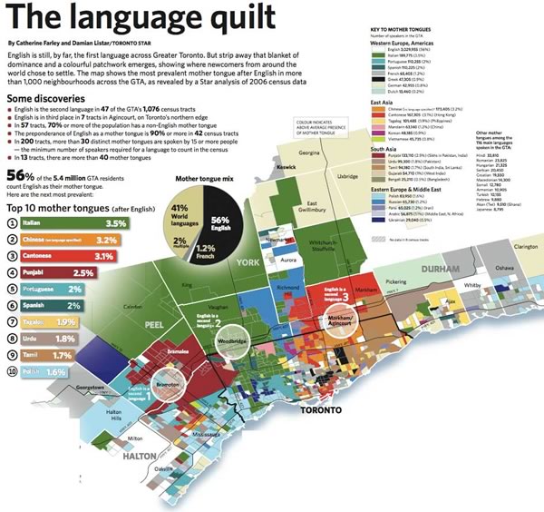 Yesterday, the Toronto Star published a map titled The Language Quilt, a map of Accordion City and surrounding areas colour-coded by prevalent mother tongue based on 2006 census data. If you’re willing to download a 20-megabyte PDF file, you can get the map plus the accompanying article here.