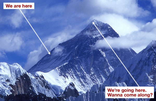 Categories Picture of Mount Everest. “We are here” points to a spot halfway up the mountain. “We’re going here. Wanna come along?” points to the summit. Post author By Joey deVilla Post date March 28, 2008 No Comments on Picture of Mount Everest. “We are here” points to a spot halfway up the mountain. “We’re going here. Wanna come along?” points to the summit. Leave a ReplyYou must be logged in to post a comment.