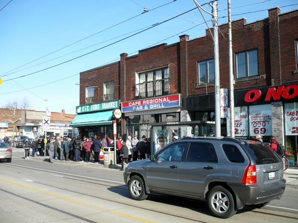 While biking eastbound on Dundas Street West to work this morning, I spotted a long line that stretched around the the corner of Dundas West and Rusholme. The reason? Free chicken legs!