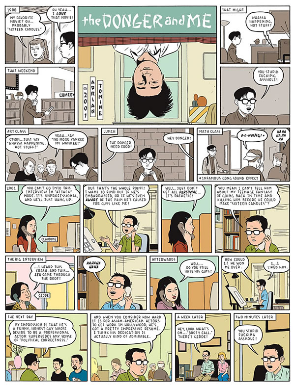 But seriously: yeah, the reason Long Duk Dong doesn’t get my blood boiling was that of all the racial jabs hurled at me, not one of the ones I was aware of were Dongerisms. Had the popular white kids in high school pulled the “No mo’ yanky my wanky!” thing on me, my reaction to the Donger would’ve been more along the lines of Adrian Tomine’s. (But not so over-the-top emo. Dude must’ve had a terrible adolescence.)