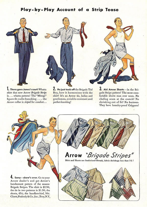 If you showed the ad below for Arrow menswear to an advertising exec today, s/he’d probably say: “Too wordy! You can’t see the real product! The illustrations are too small!” It’s a shame, because I rather like the style of these old ads: