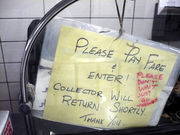 As a result, High Park station doesn’t seem as heavily staffed, which means that the ticket collector is often alone, with no one to relieve him or her when it’s time for a bathroom run (or to use the increasing popular office culture term, a “bio break”). When nature calls, the collector answers, and this sign goes up: