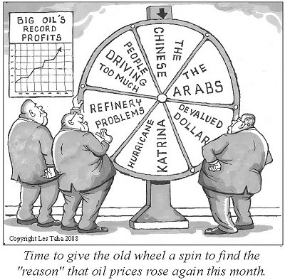 Editorial cartoon featuring executives spinning a big wheel to determine the “reason” oil prices rose this month