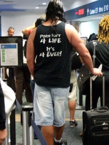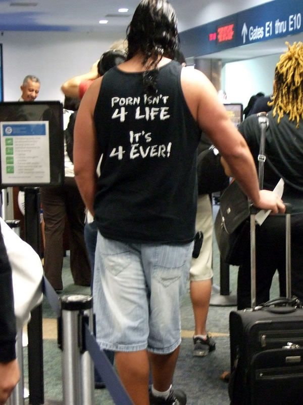 Guy at airport security line wearing tank top that reads “Porn isn’t 4 life — it’s 4 ever!”
