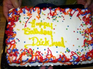 Categories “Happy birthday, Dickhead” cake “Happy birthday, Dickhead” cake Post author By Joey deVilla Post date August 15, 2008 No Comments on “Happy birthday, Dickhead” cake Leave a ReplyYou must be logged in to post a comment.