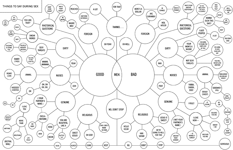 Categories “Things to Say During Sex” chart “Things to Say During Sex” chart Post author By Joey deVilla Post date August 28, 2008 No Comments on “Things to Say During Sex” chart Leave a ReplyYou must be logged in to post a comment.