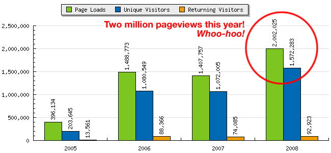 StatCounter says that sometime within the half-hour before I wrote this, The Adventures of Accordion Guy in the 21st Century got its 2 millionth page view for 2008. My thanks to all of you for making this possible!