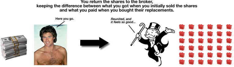 You return the shares to the broker, keeping the difference between what you got when you initially sold the shares and what you paid when you bought their replacements.