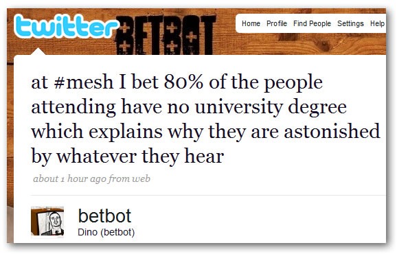 Categories betbots-dick-tweet.jpg Post author By Joey deVilla Post date April 8, 2009 No Comments on betbots-dick-tweet.jpg Leave a ReplyYou must be logged in to post a comment.