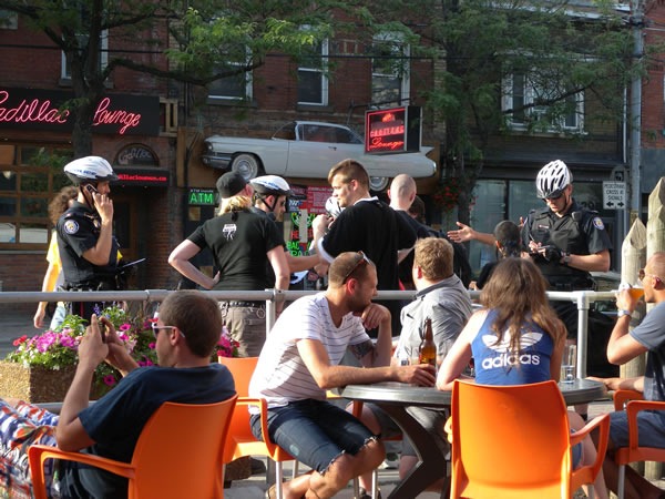 We were sitting on the patio at The Rhino (Queen Street West, west of Dufferin) when a guy started calling out to the patio-dwellers, announcing that 4 cops were writing him a jaywalking ticket: