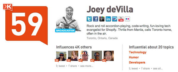 That changed as of yesterday. Cathay Pacific signed a deal with Klout, the web service that assigns people a score based on their influence across social media, such as Twitter, Facebook, Google+ and so on. If you have a Klout score greater than 40, you can use their lounge at San Francisco’s airport as if you were a first class passenger. Next to me, The World’s Greatest Accordion-Playing Tech Evangelist and the Thrilla from Manila, I qualify by a decent margin: