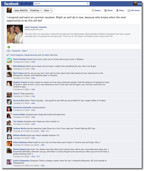 The well-wishes on Facebook and other online places in response to my announcement of going on summer vacation have been amazing. I wasn’t expecting much of a response, especially the “Dude, you’re my hero” sort. I was just lucky enough to have some money socked away, a nice tax refund, a pile of frequent flyer points I’ve been saving for just such an occasion, and some Microsoft stock to sell before it’s too late. My former employer, Shopify, have been nothing but cool and generous about the whole thing. I have neither debt nor kids, my expenses are few and my network and rep are such that I can either find a job or make one when it’s time. I think of what I’m doing as equal parts pragmatic and lucky, not courageous or anything special.