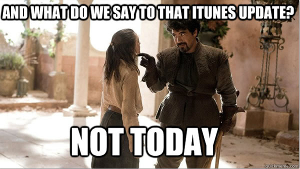 Categories Uncategorized Game of Thrones, Meet iTunes Post author By Joey deVilla Post date July 18, 2012 No Comments on Game of Thrones, Meet iTunes Click the photo to see the original. I’ve said “Not Today” to iTunes Update a few times myself. ← We’ve All Been to This Theme Park… → Track of the Day: “Falling” by Digitalism Leave a ReplyYou must be logged in to post a comment.