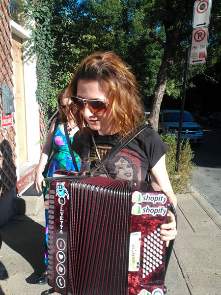 The Lady Friend and I started to make our way to Au Pied de Cochon later that afternoon, so I invited Fred and Émilie to join us on the walk there. Fred had told me that Émilie had always wanted to take up the accordion, so I let her take it out for a spin. Fred took this photo of her, and he also wrote about it on his blog, Out of Comfort Zone: