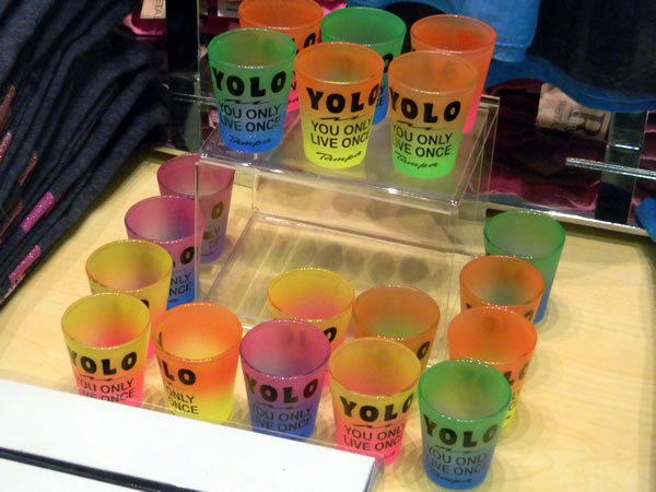 YOLO probably started as a less bookish way of saying “Carpe diem“, but it’s devolved into a battle cry you yell out before doing something dangerous or embarrassing while drunk or stoned. But taking a dumb catchphrase putting it on a shot glass and still selling it after Ervin McKinness’ infamous tweet made minutes before he died in a drunk-driving accident: