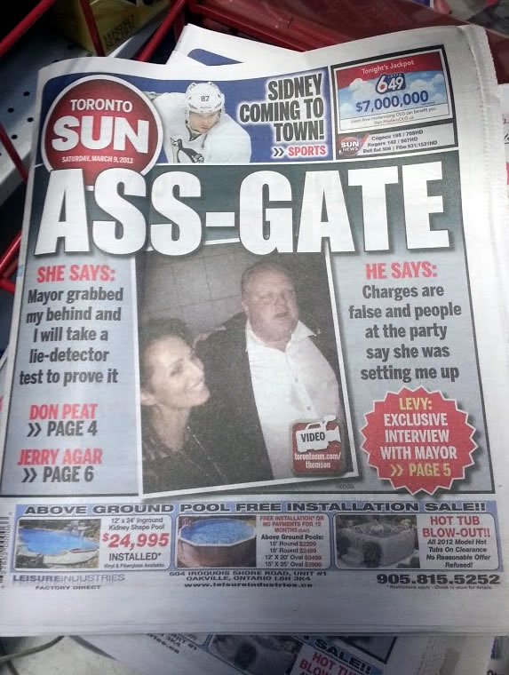 The opportunity to print the word “Ass” in a headline size normally reserved for declarations of war comes only once in the career of the editor of a respectable newspaper, and a half-dozen times if you’re the editor of the Toronto Sun. Still, one must sink to the occasion when the opportunity arises!