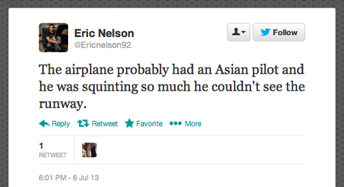 racist tweet 4 – eric nelson Post author By Joey deVilla Post date July 8, 2013 No Comments on racist tweet 4 – eric nelson Leave a ReplyYou must be logged in to post a comment.
