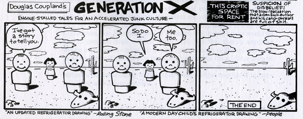 Once upon a time, as the 1980s were turning into the 1990s, a young designer received a $22,500 advance for writing a handbook on his birth cohort, people born in the 1960s, which seemed to lack an identity. He used the money to move to warmer, drier climes — Coachella Valley and the Mojave Desert — to work on his book, which along the way turned from an extended Cracked article into a novel starring three aimless characters who just happened to live the same sort of warm, dry clime where he was doing his writing. The publisher who paid him the advance first turned down the book, but changed their minds afterwards, and it hit bookstores in 1991. The designer was Douglas Coupland, and the book was Generation X: Tales for an Accelerated Culture.