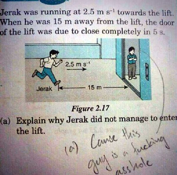 Okay, the written-in answer is correct in the practical sense, but if you can’t figure out the mathematically correct answer — that is, the distance and time by which Jerak missed the elevator, you may have a math problem.