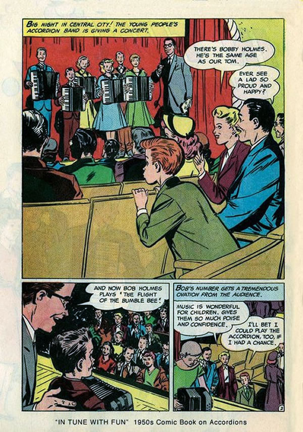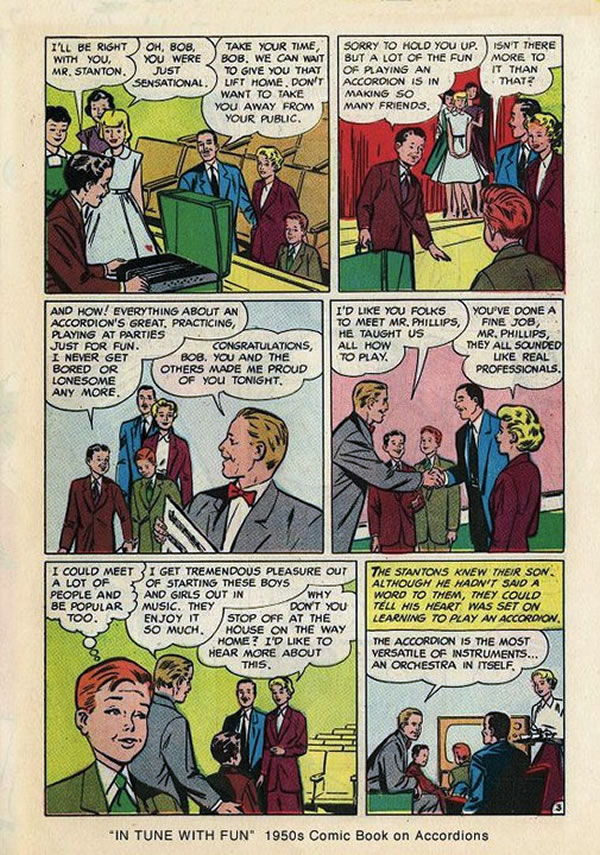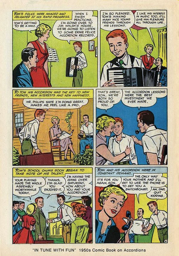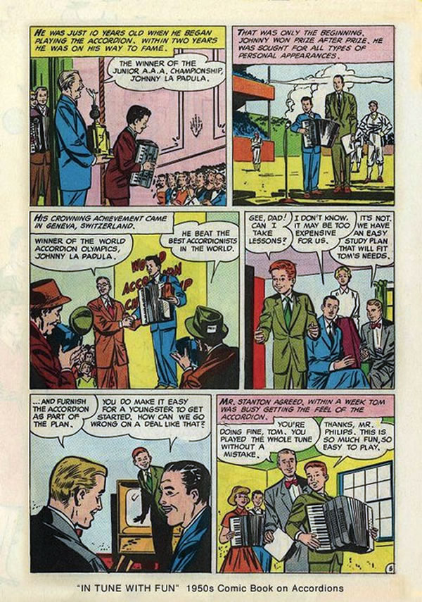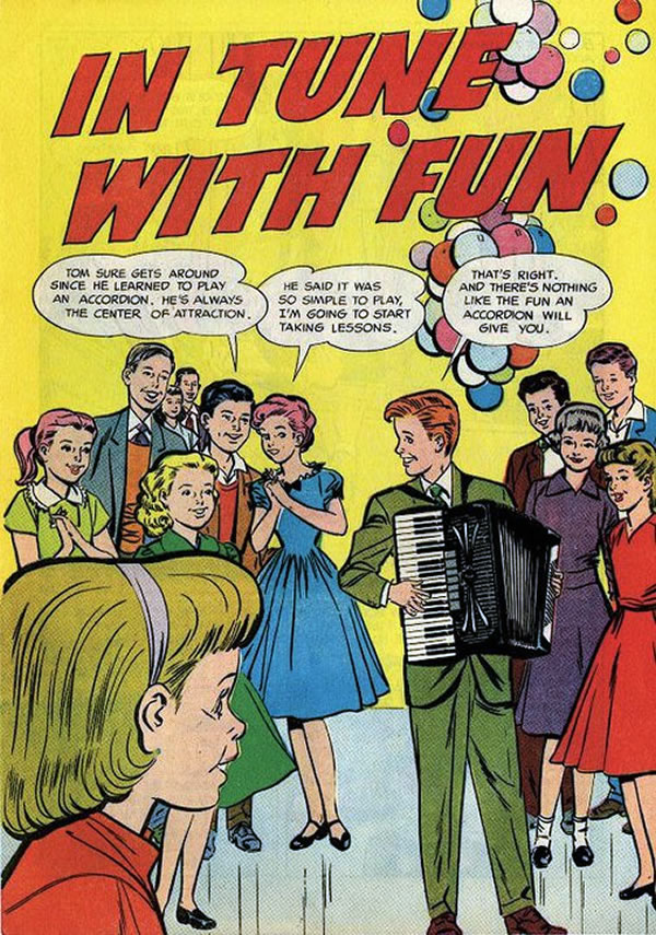 This 1950’s comic book advertisement is pretty much my life after May 1, 1999, the day I first took the accordion out on the streets: