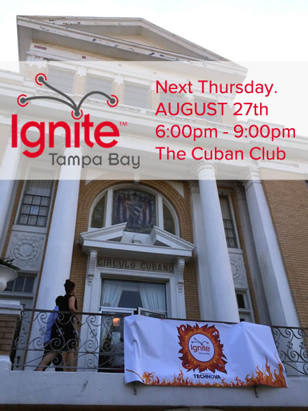 Ignite Tampa Bay takes place in Tampa next Thursday, August 27th from 6:00 p.m. to 9:00 p.m. at the Cuban Club…and Yours Truly will be one of the speakers!