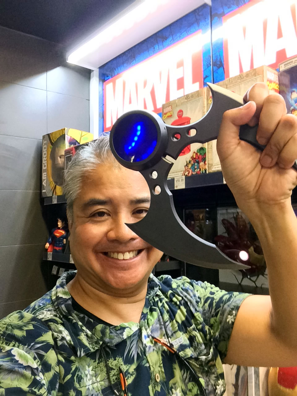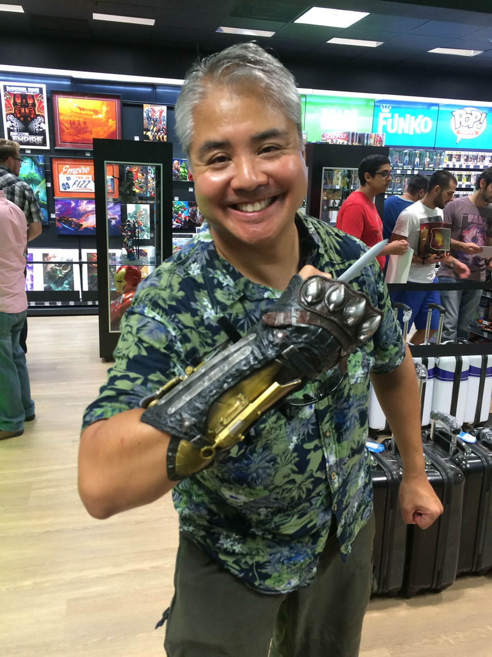 Here’s Anitra and store guy Kenneth demonstrating why the “stabby gauntlet” should be used only for killing and not for giving out high-fives: