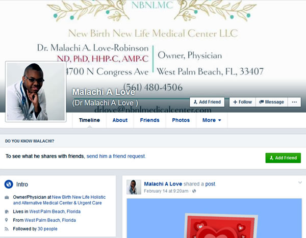 His Facebook page doesn’t exist anymore, but here’s a screen capture. As you can see, Love-Robinson went by “Dr. Love” on the page, which would be my runner-up choice if I had to use a fake doctor name. “Dr. Feelgood” is still my first choice: