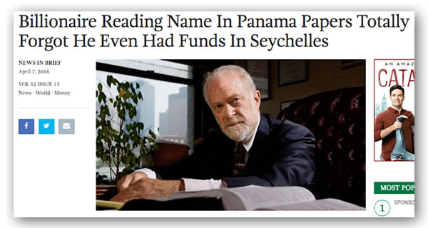 The Onion may have been playing it up for laughs when they wrote the article titled Billionaire Reading Name In Panama Papers Totally Forgot He Even Had Funds In Seychelles, but like some of their best articles, there’s a surprisingly big nugget of truth in it.