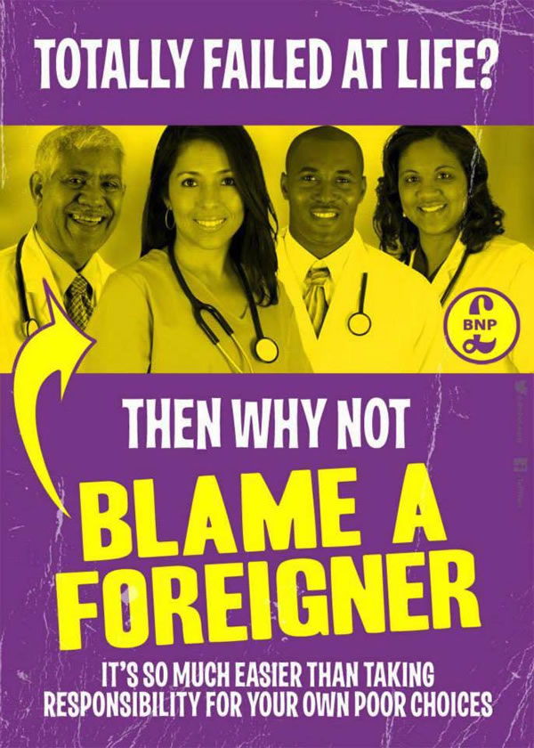 Here’s a more direct image of the poster, with the UKIP logo modified to feature the BNP, the British National Party, another terrible bunch: