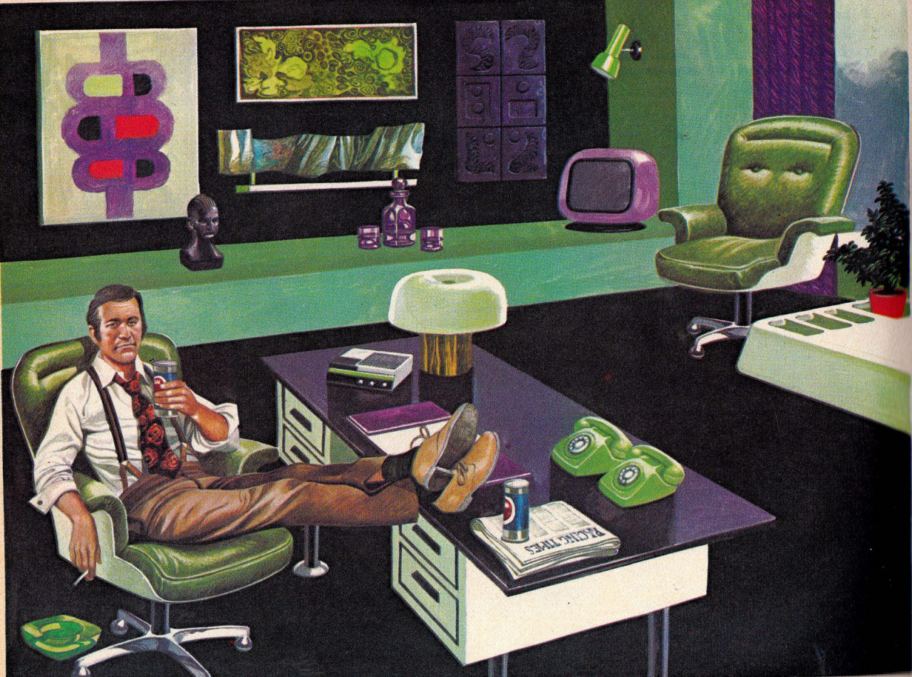 The illustration above comes from Volume 3 of Understanding Human Behavior, a 24-volume series of books published in — as you might have guessed — 1974. I love the Lex Luthor / Joker purple-green color scheme in that office!