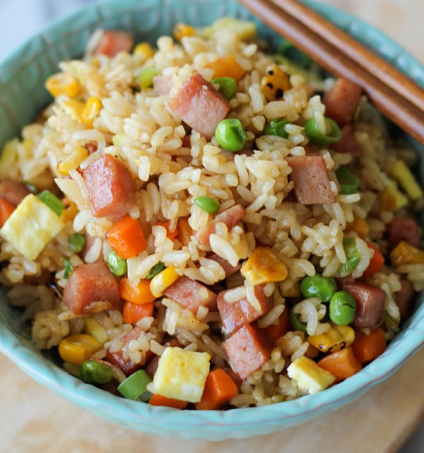 …and Spam fried rice, which treats Spam as a softer, more easily sliced version of Chinese sausage: