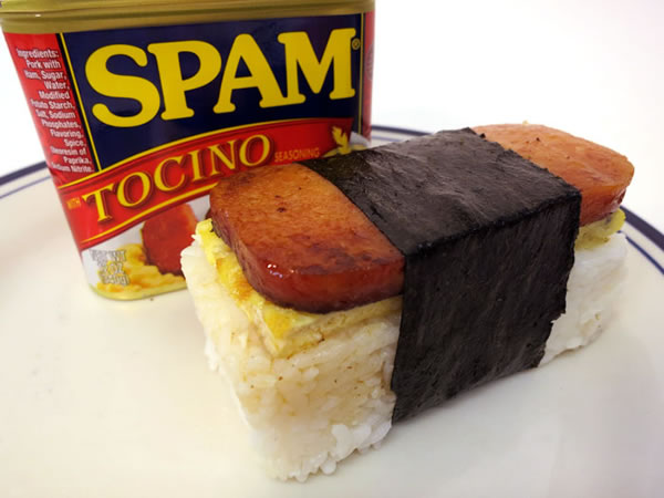 In fact, Spam is the key ingredient in a lot of Asian/Pacific island dishes, including Spam musubi (sometimes mistakenly referred to as Spam sushi, but if the rice isn’t vinegared, it ain’t sushi)…
