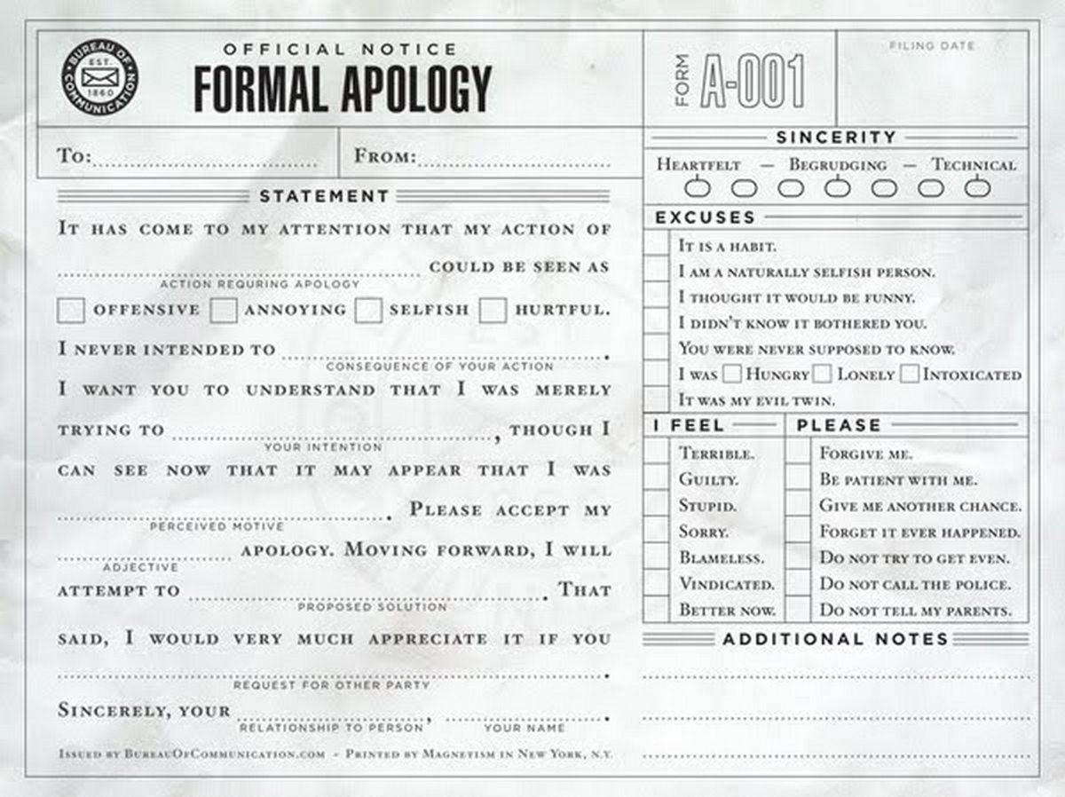 Sooner or later, you’ll end up in a situation where you are in the wrong and will have to make some kind of apology. When this happens, you should keep in mind that in building civilization over the past 10,000, we’ve had plenty of time to refine the art of the apology. There’s no shortage of resources out there that cover the topic of saying “I’m sorry.”