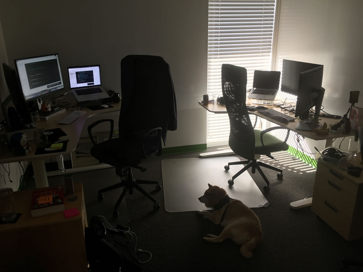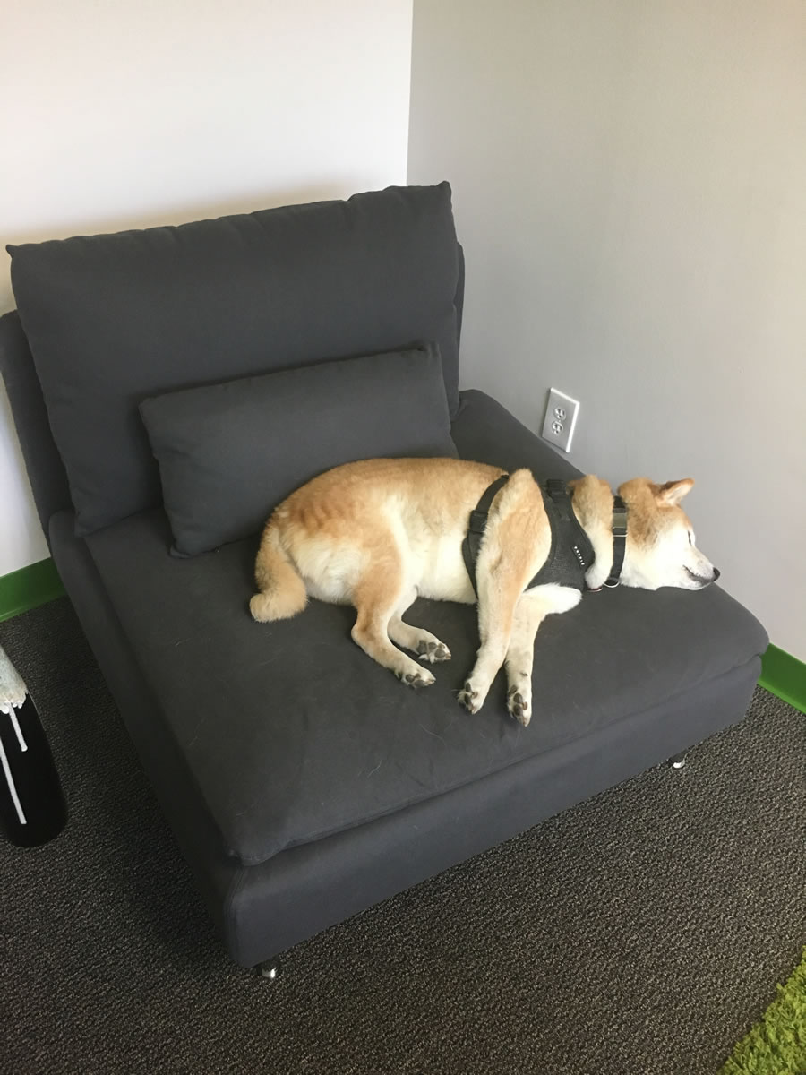 On Wednesdays, Sourcetoad’s marketing manager Graeme, brings in his Shiba Inu, Sun Sin, to the office. Sun Sin’s an older dog — 12 years old, which would put him in his 80s if he were a human — and he’s oddly cat-like in his aloofness. He’s free to roam the office, and he’s welcome in the one I share with Nick, the director of projects, which is where I found him when I took the photo above. I gave him a ear rub, and worked on a big presentation while he chilled out.