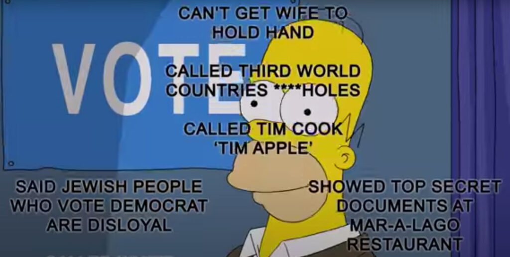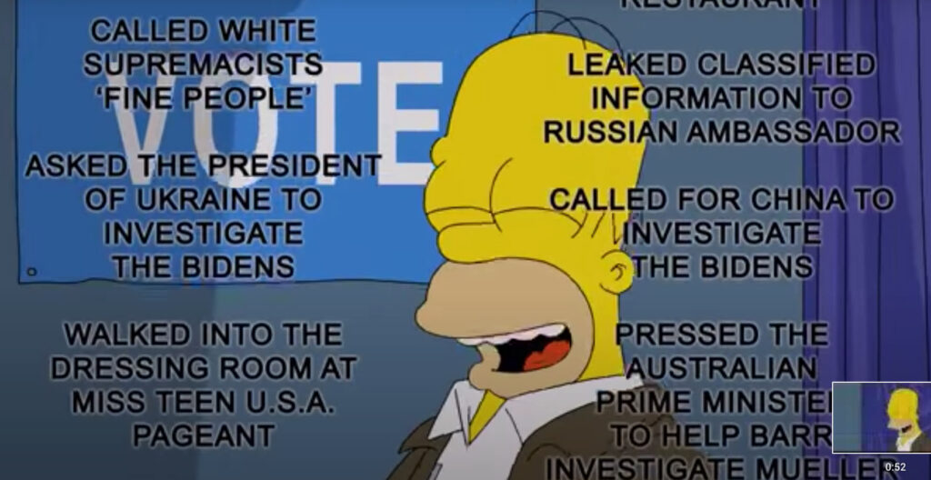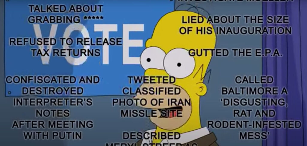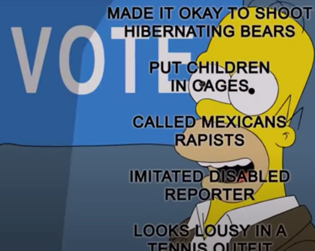 The upcoming “Treehouse of Horror” episode of The Simpsons features this segment listing 50 reasons to NOT vote for Trump, and believe me, there are plenty more, including his profiting off the Secret Service, and having taxpayers cover the $100+ million costs of his 250+ days of golfing.