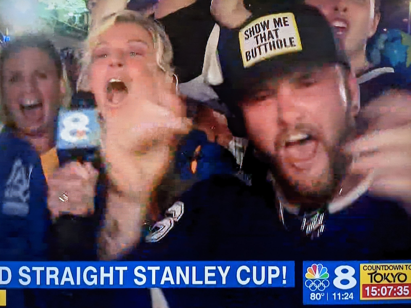 The Tampa Bay Lightning are a Florida Team, and as such, they have Florida Fans. I knew I could count on them to uphold the Sunshine State’s reputation for its locals making questionable choices, and the fan with the “Show me that butthole” cap didn’t let me down.