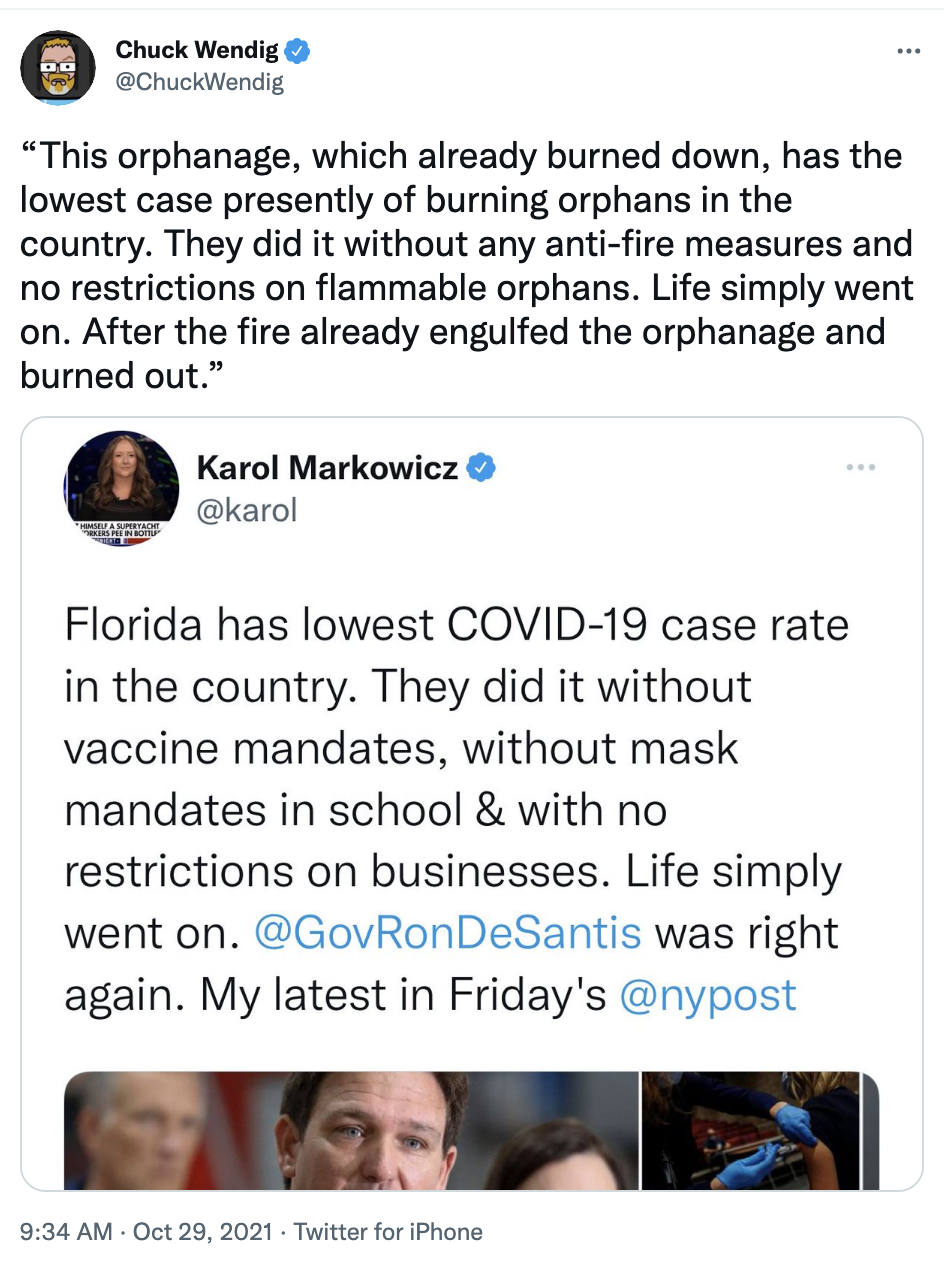 You may have already seen the triumphant tweet from Karol Markowicz, who’s shilling her article in the New York Post as well as Governor Ron DeSantis’ news release about Florida now having the lowest COVID-19 case rate.